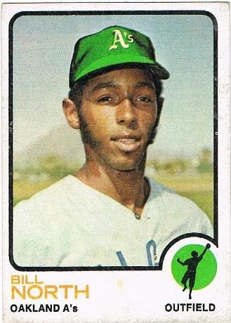 And here are the other cards I won in the contest. First up, a 1973 Topps Bill North card, on which Thorzul helpfully pointed out that the airbrush operator forgot to cover up the Chicago jersey. Oops.